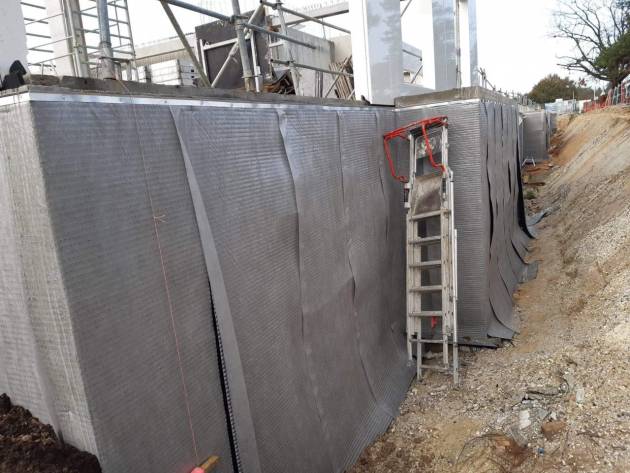 Dans le cadre de la construction de la nouvelle agence Pôle Emploi Bersol - Pessac (33), AFITEXINOV a fourni 1000 m2 d'ALVÉODRAIN P5 afin d'assurer à la fois l'imperméabilisation et le drainage vertical des parois enterrées.
